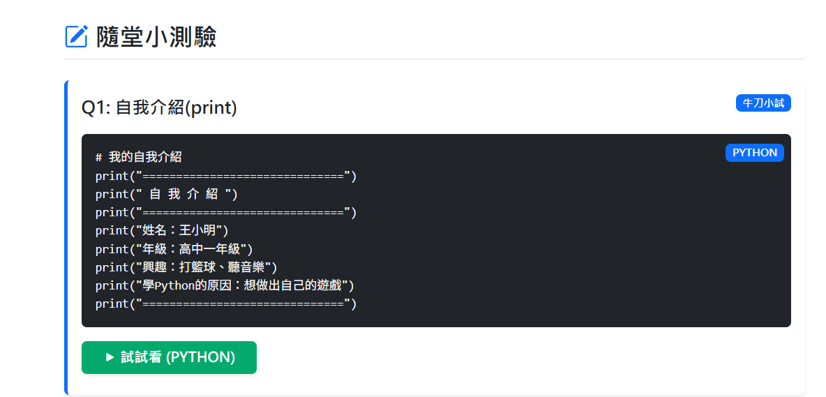 另外一種「牛刀小試」,可以讓同學按下「試試看」按鈕,自由修改裡面的示範程式,看看會有什麼執行結果: