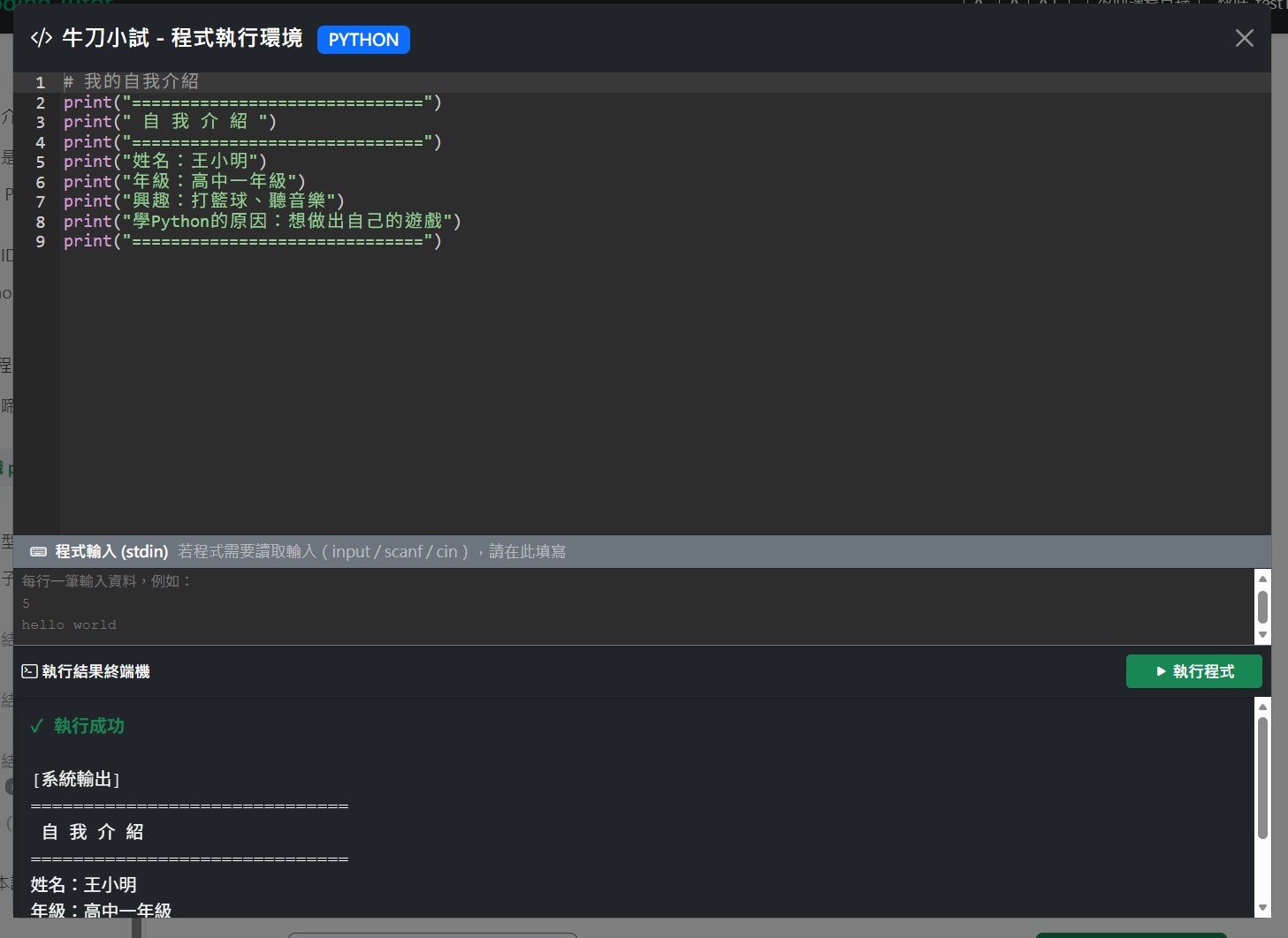 下圖為牛刀小試的執行視窗,上方提供程式語言編輯器,中間的程式輸入可讀取stdin的文字進行測試,下方則是程式的執行結果。