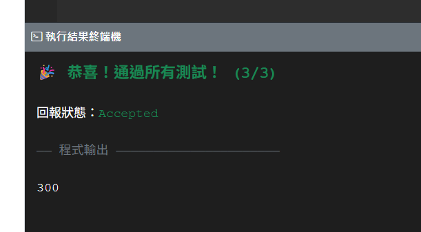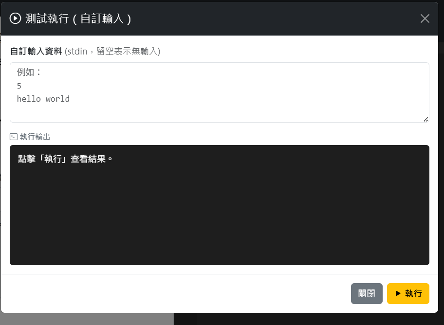 - 測試執行:可自行輸入測試資料,看看執行的結果(不提供評分)。