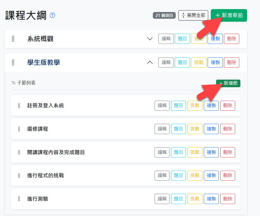 本系統的課程內容採用兩層式架構(章與節),章節皆可輸入內容,並附加題庫、挑戰題及附件。