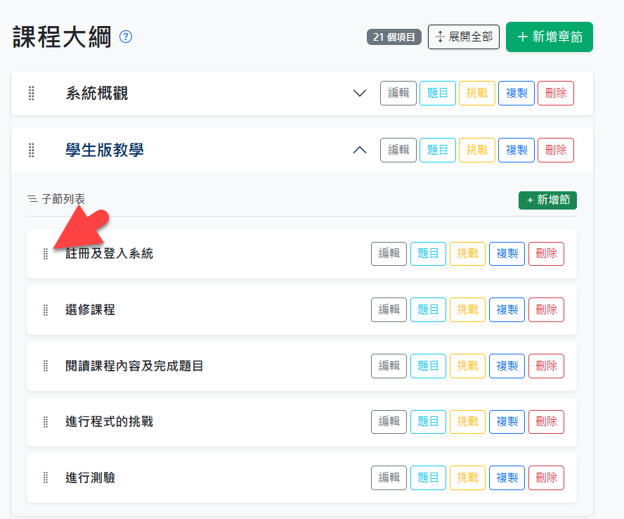 每個章節前方都有一個拖曳把手,可以直接用拖曳的方式來調整課程順序。