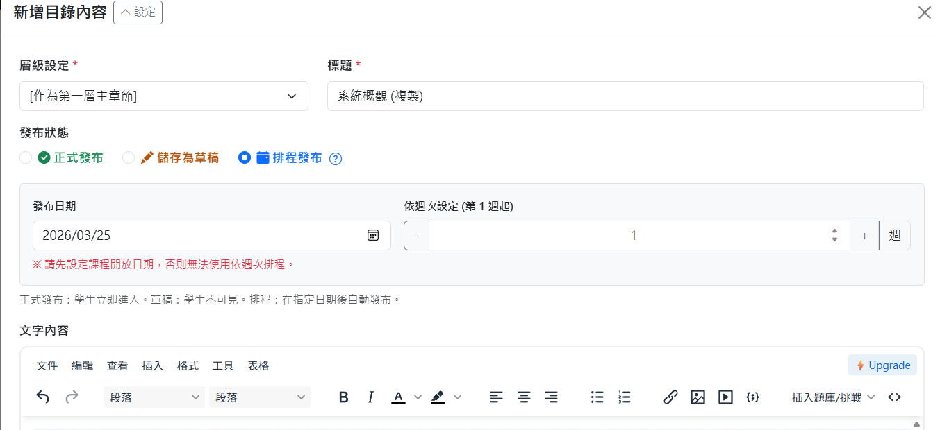 - 例如某個「章」從3月14日開放,裡面的某一「節」設成 3月7日開放,節的開放日期不能早於「章」,該節的排程是無效的。